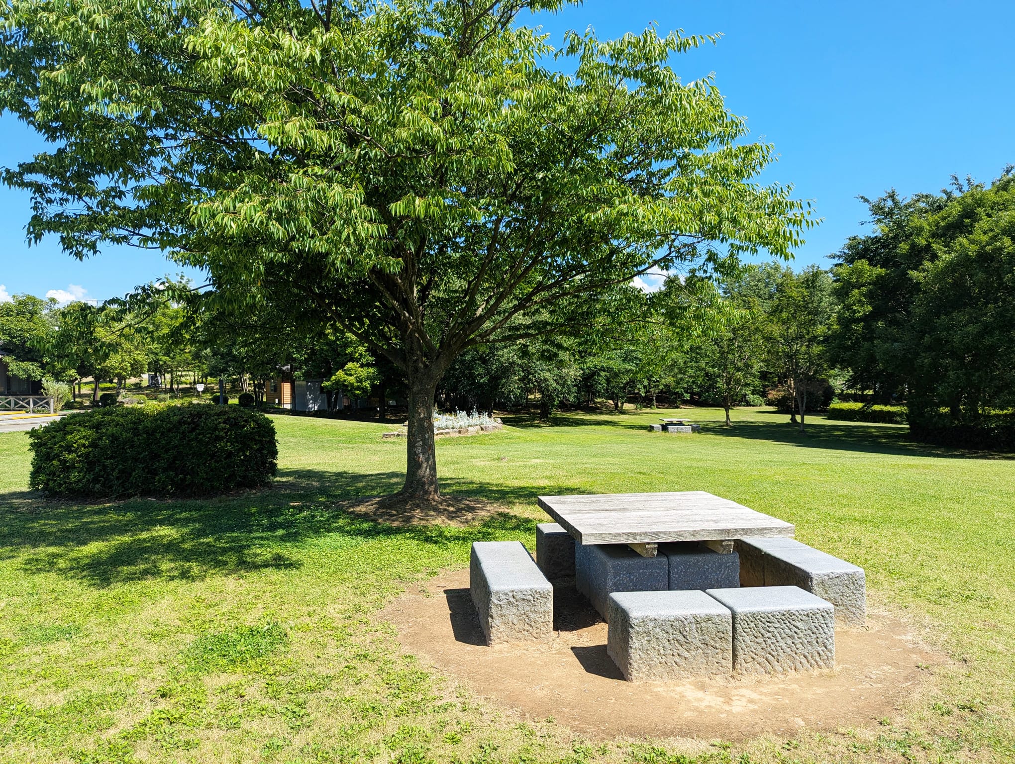 木かげのベンチや屋根付きのテーブル席があちこちに配置されていて、おさんぽの途中でふっと腰をおろせるのがうれしいポイント。