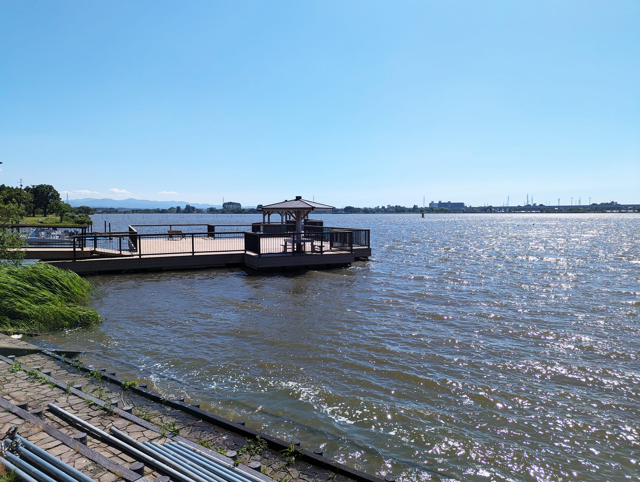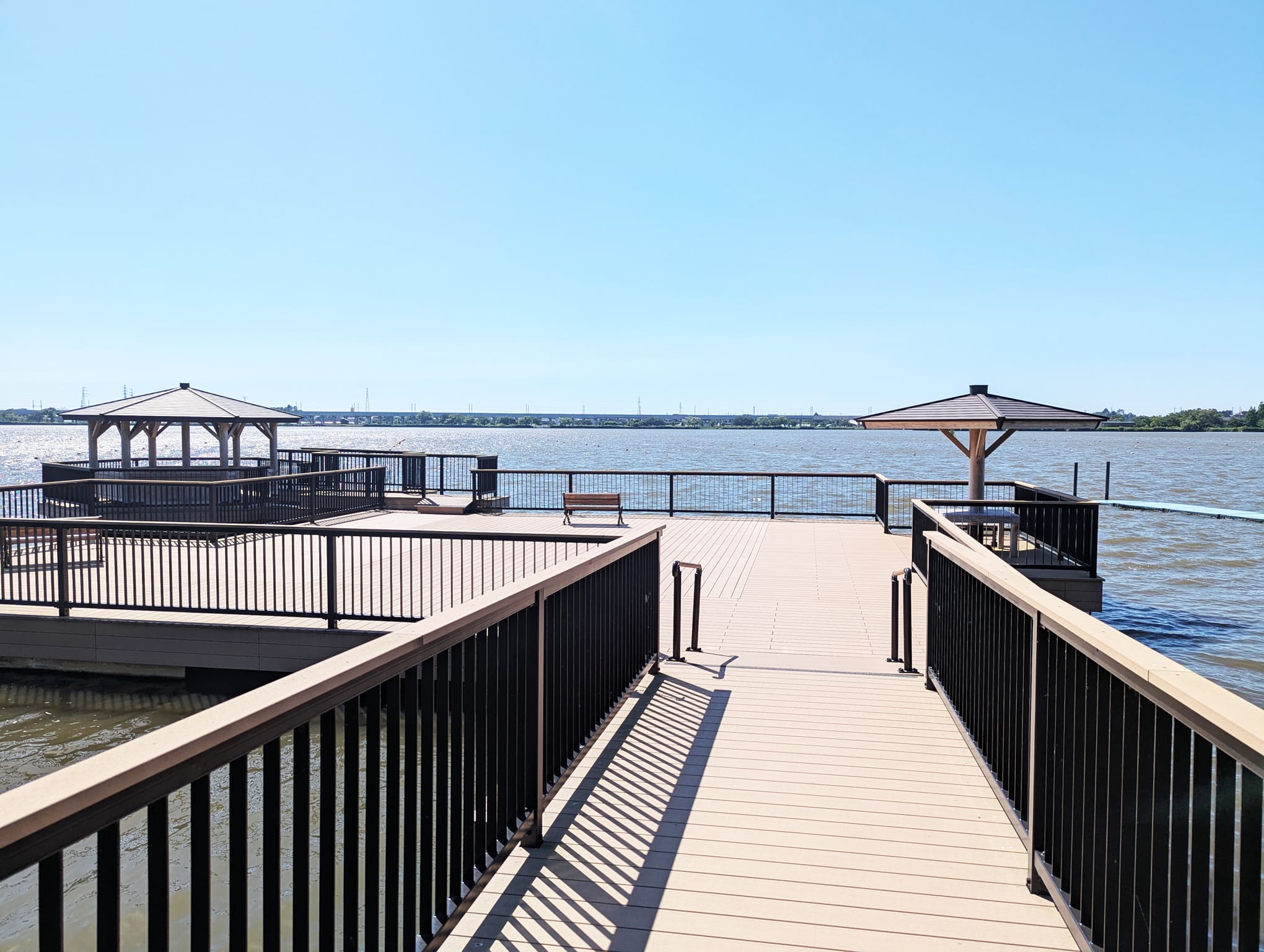 水の上にせり出したようなウッドデッキで、屋根つきベンチも設置されていて、休憩にもぴったり。