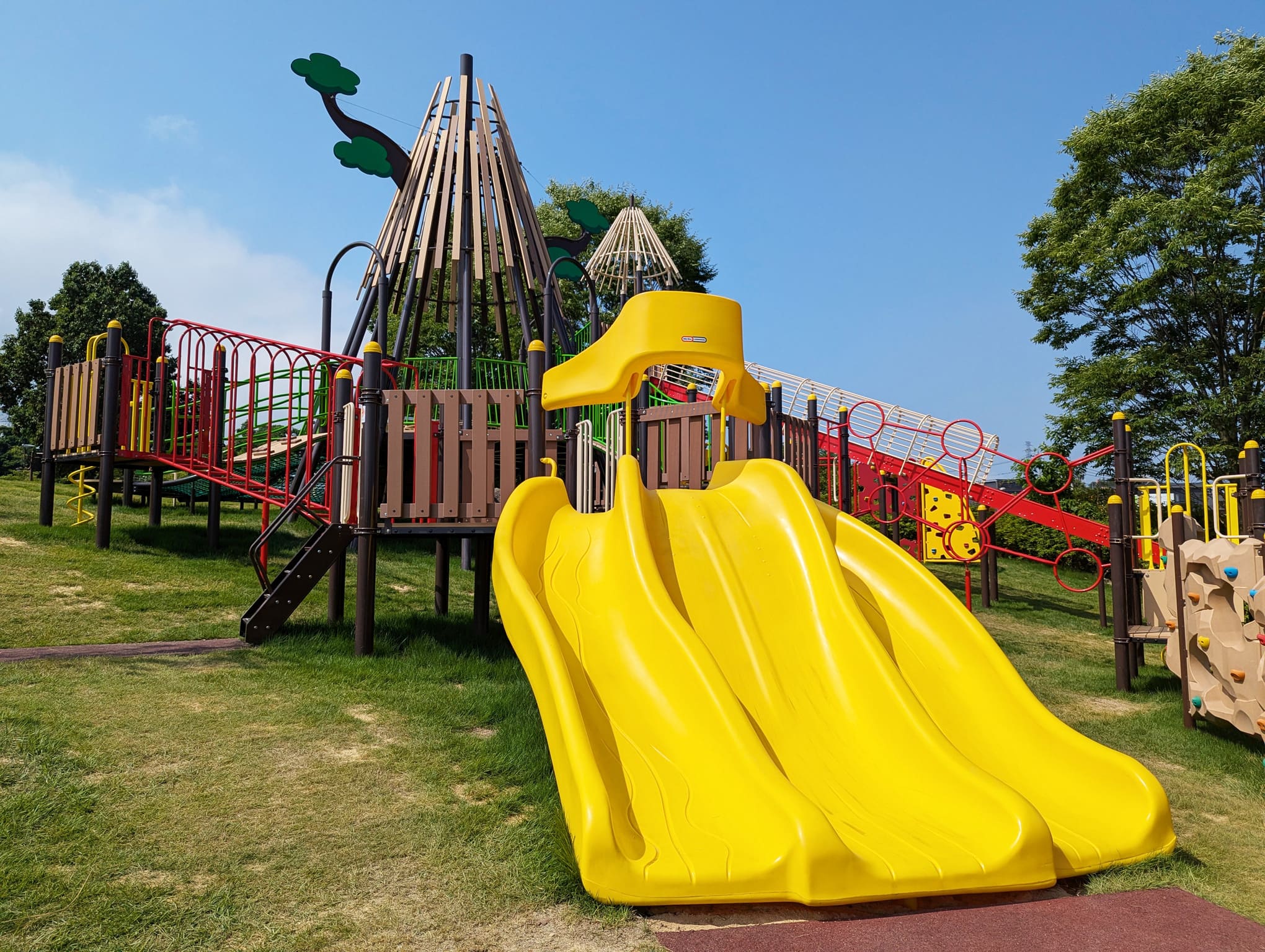 本物の木をイメージしたタワーを中心に、ネット登りや丸太橋、トンネルくぐりやすべり台などが組み合わさっていて、まるでひとつの冒険フィールド!