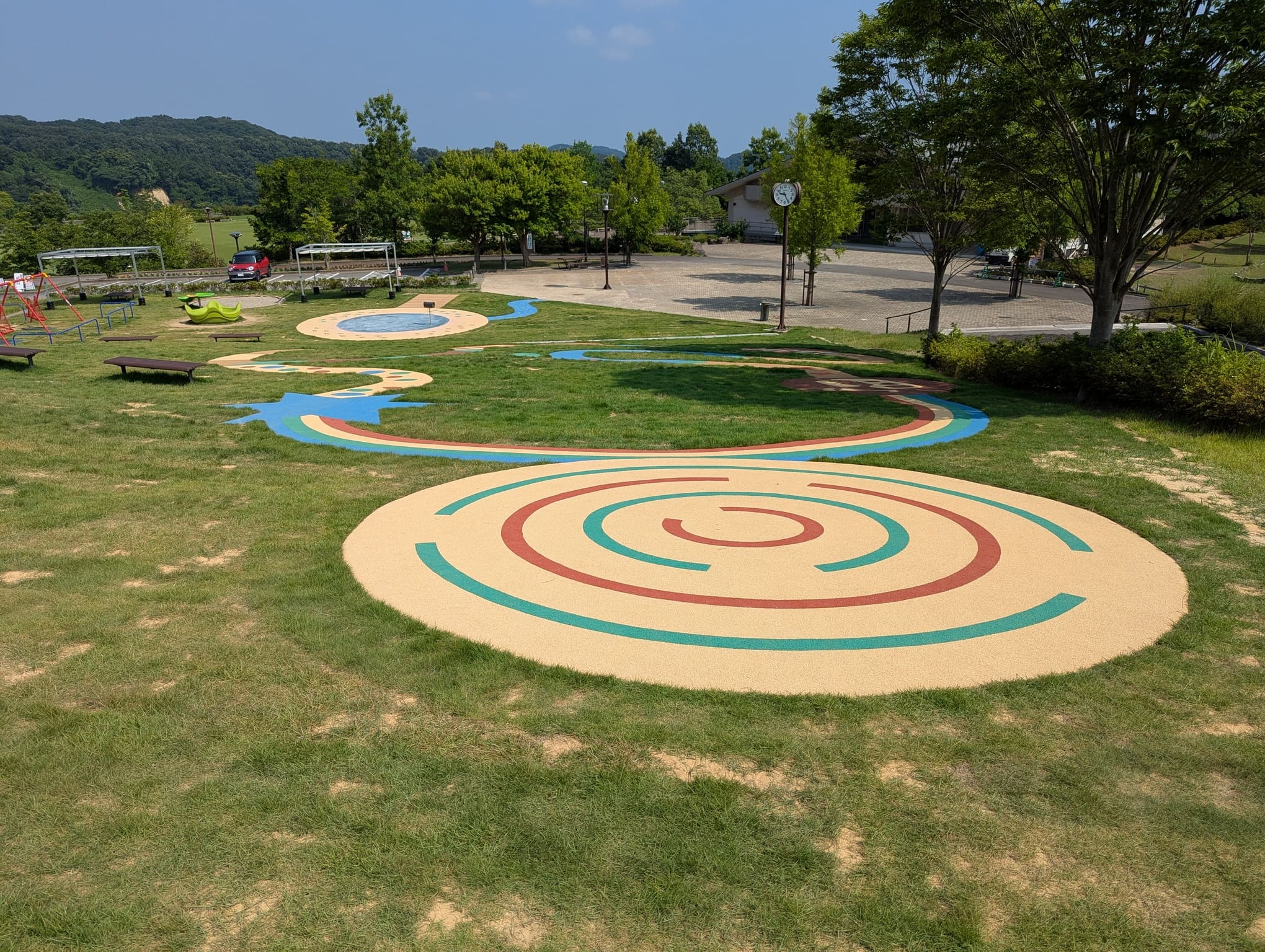 曲線やぐるぐる模様、カラフルなパターンがつづくこの道は、ただ歩くだけでも楽しく、自然と体が動き出すようなデザインになっています♪