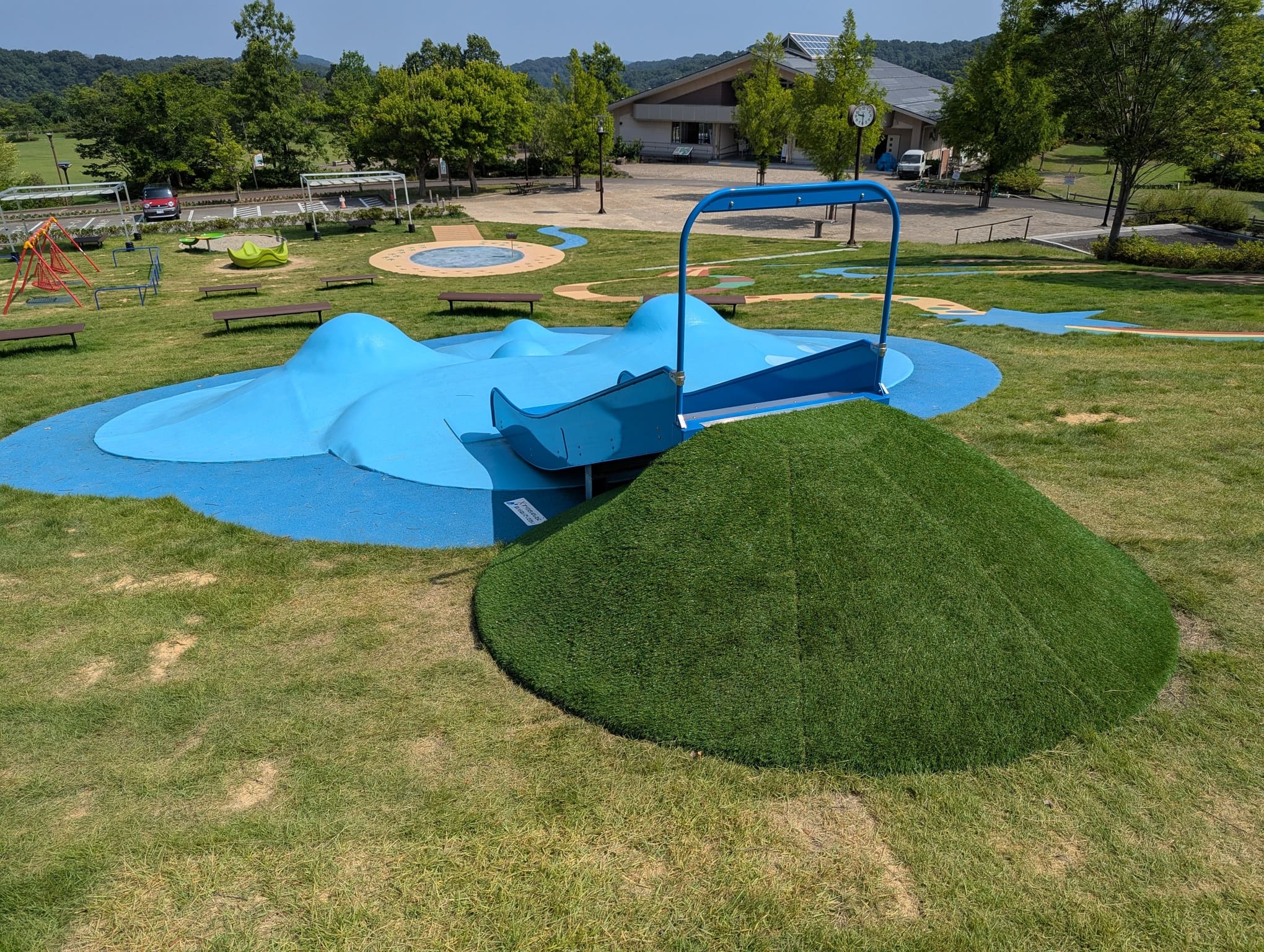 人工芝の小山からはミニすべり台もついていて、幼児に大人気のエリアです♪