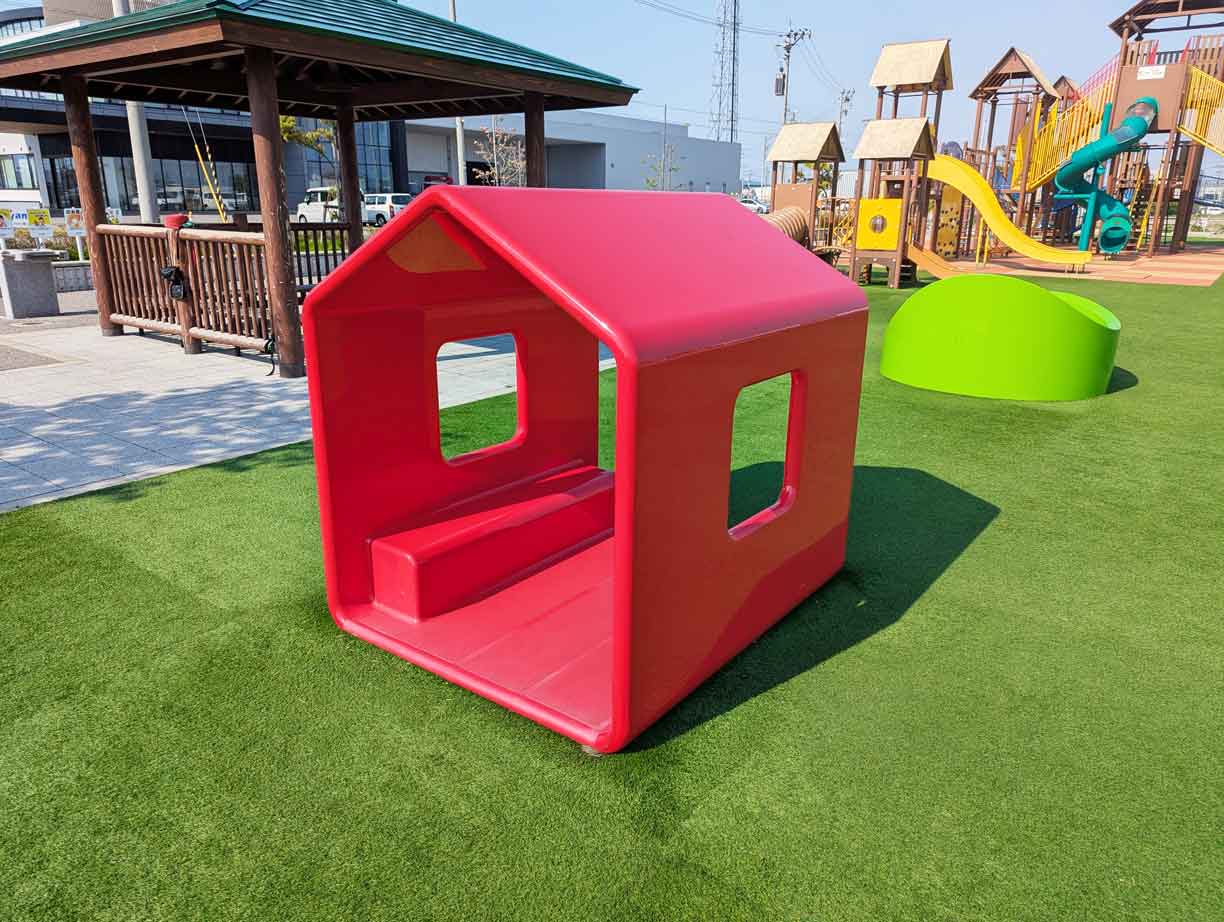 赤いおうち、かわいらしいコンビ遊具、不思議な形の遊具が並んでいて、思わず写真を撮りたくなるような光景があちこちに広がっています。