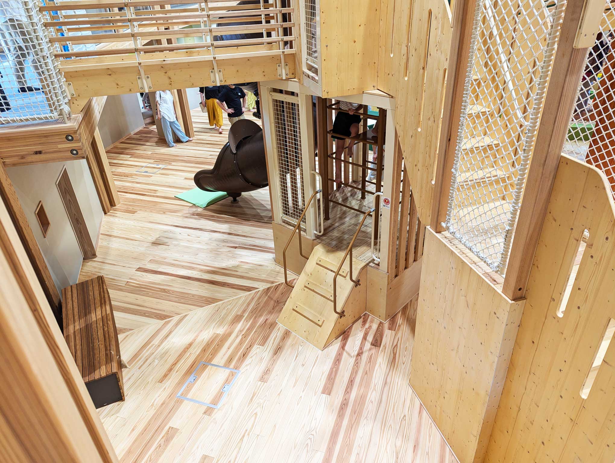 ロープネットの通路や、のぼったりくぐったりできる木の通路もあって、子どもたちは探検気分で遊べます。