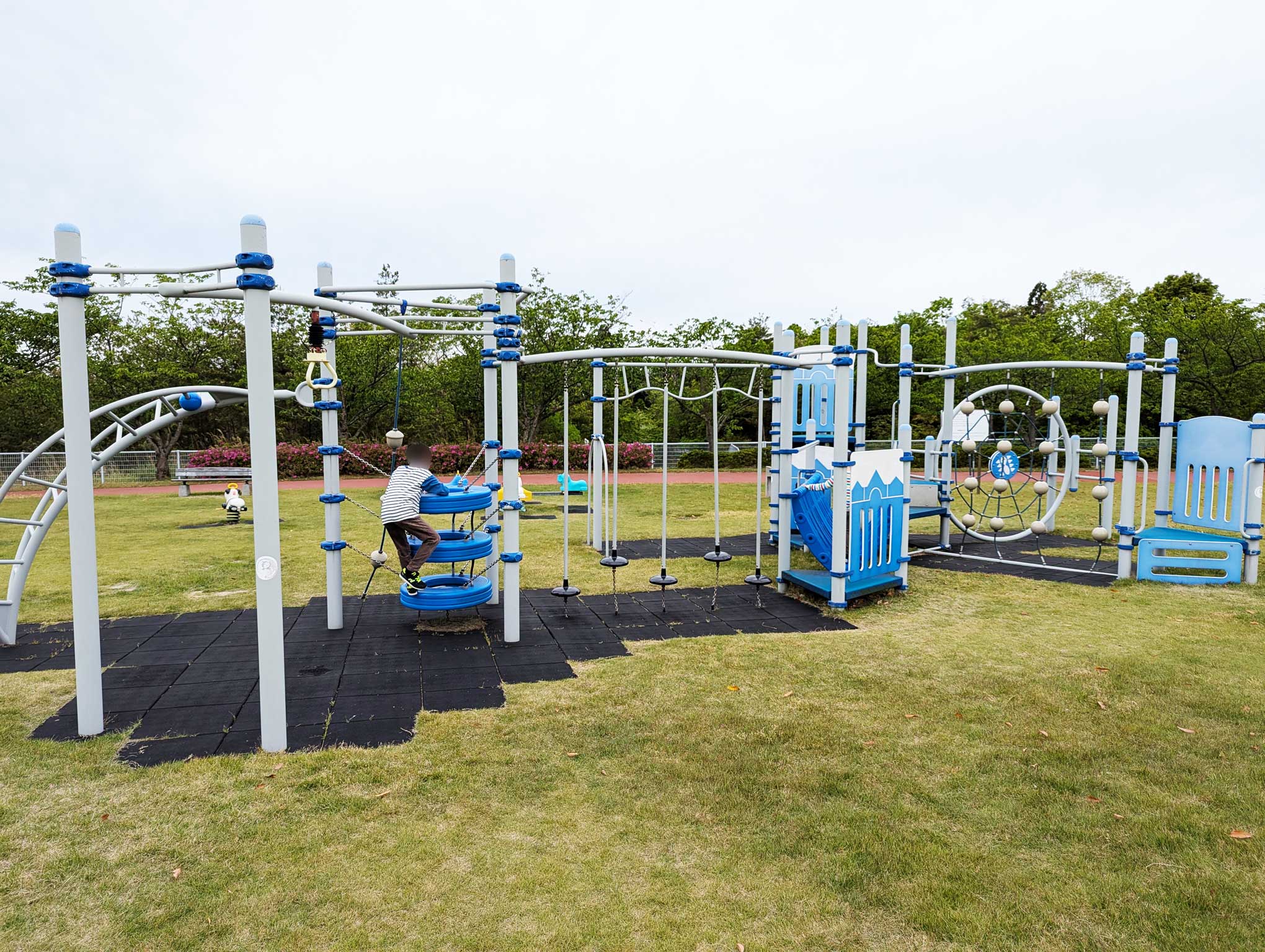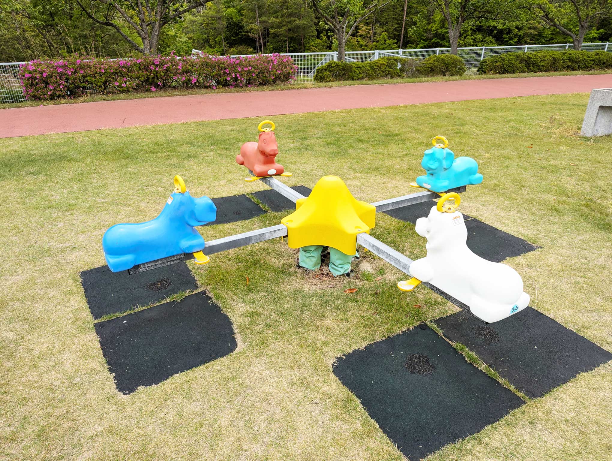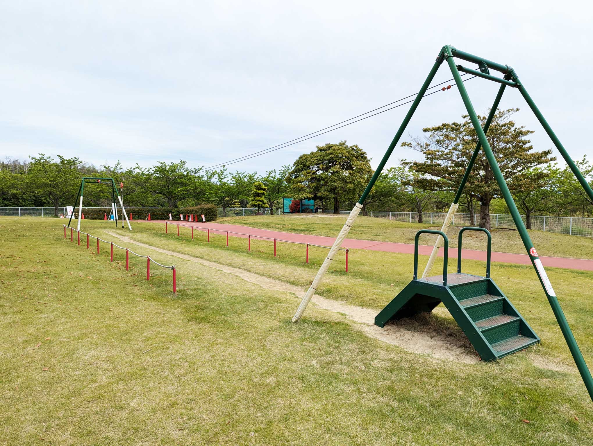 芝生が広がるお庭には、ターザンロープやおもしろ自転車、変形自転車などユニークな遊具がずらり。