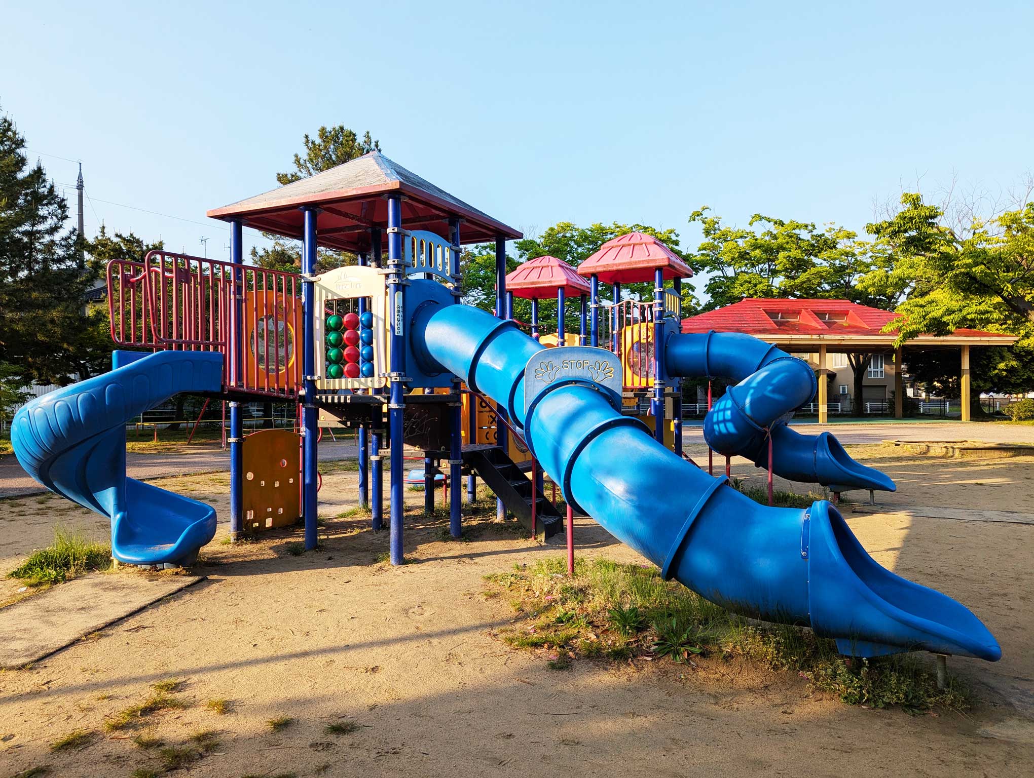 赤い屋根が目印で、雨の日や強い日差しの日にも遊んだり休憩したりできる頼れる存在です♪
